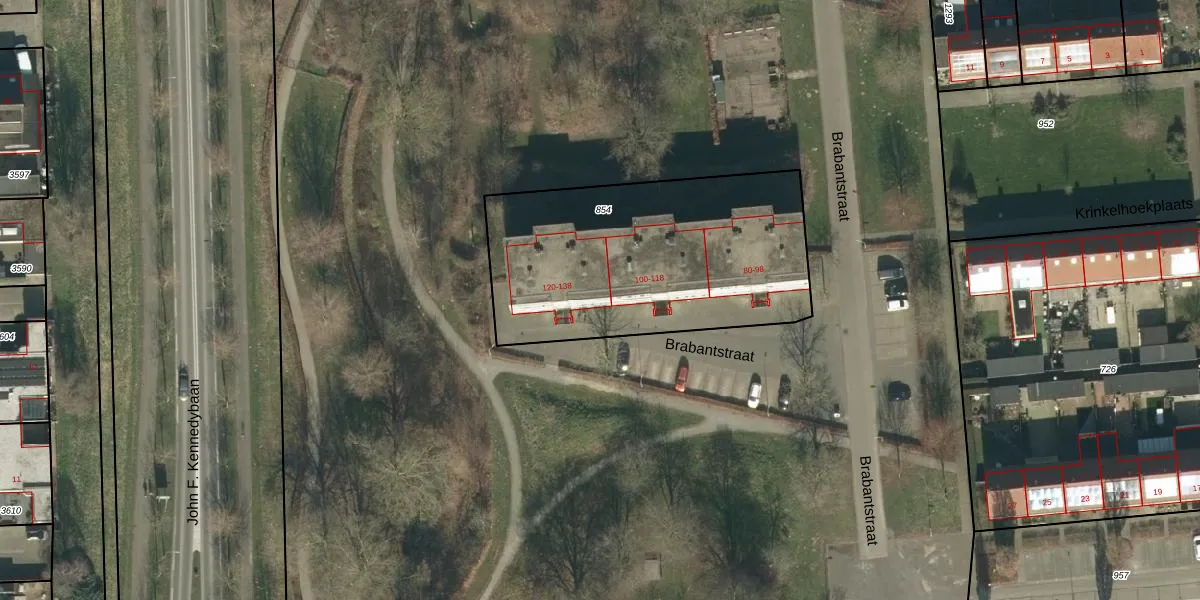 Het perceel waarop Brabantstraat 120 staat heeft een oppervlakte van 1322 m². Dit is een zeer groot perceel. De perceeloppervlakte wordt geregistreerd door het Kadaster. Gedetailleerde informatie over de maten van dit perceel kunt u vinden in het rapport Kadastrale kaart met maatvoering van Brabantstraat 120.