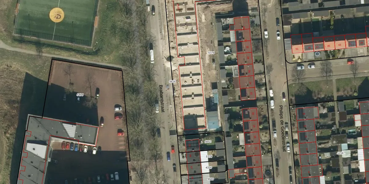 Het perceel waarop Brabantstraat 59 staat heeft een oppervlakte van 5659 m². Dit is een zeer groot perceel. De perceeloppervlakte wordt geregistreerd door het Kadaster. Gedetailleerde informatie over de maten van dit perceel kunt u vinden in het rapport Kadastrale kaart met maatvoering van Brabantstraat 59.