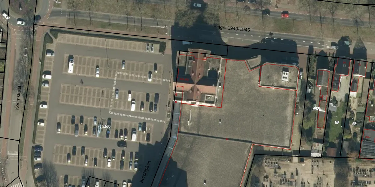 Het perceel waarop Burchtplein 114 staat heeft een oppervlakte van 7144 m². Dit is een zeer groot perceel. De perceeloppervlakte wordt geregistreerd door het Kadaster. Gedetailleerde informatie over de maten van dit perceel kunt u vinden in het rapport Kadastrale kaart met maatvoering van Burchtplein 114.