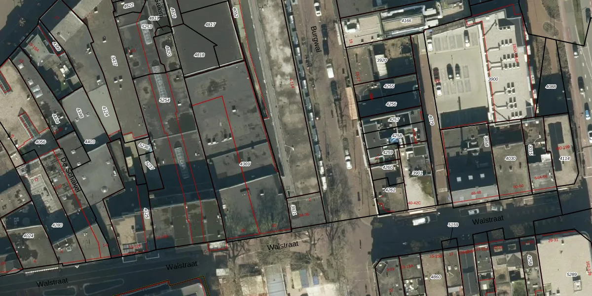 Het perceel waarop Burgwal 54 staat heeft een oppervlakte van 1250 m². Dit is een zeer groot perceel. De perceeloppervlakte wordt geregistreerd door het Kadaster. Gedetailleerde informatie over de maten van dit perceel kunt u vinden in het rapport Kadastrale kaart met maatvoering van Burgwal 54.
