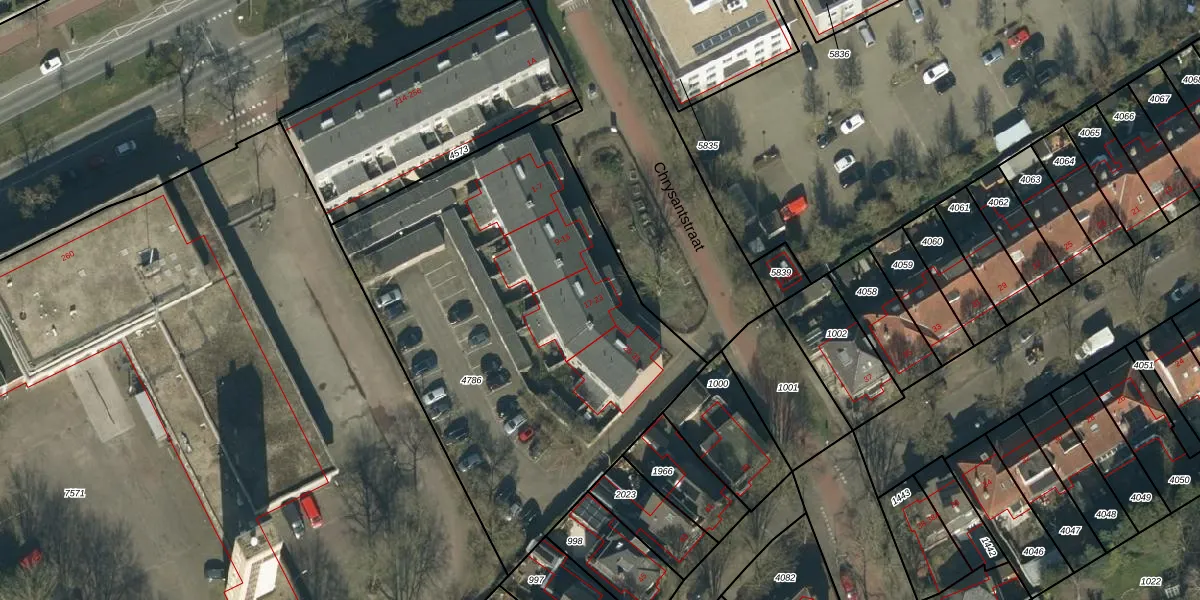 Het perceel waarop Chrysantstraat 23 staat heeft een oppervlakte van 2396 m². Dit is een zeer groot perceel. De perceeloppervlakte wordt geregistreerd door het Kadaster. Gedetailleerde informatie over de maten van dit perceel kunt u vinden in het rapport Kadastrale kaart met maatvoering van Chrysantstraat 23.