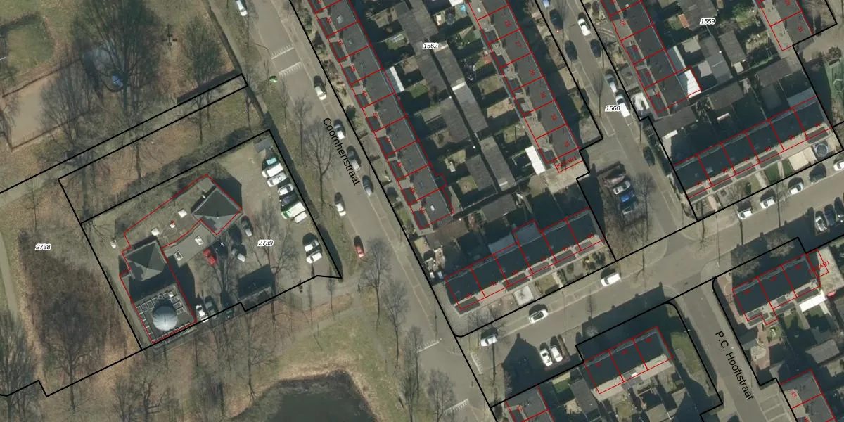 Het perceel waarop Coornhertstraat 50 staat heeft een oppervlakte van 6554 m². Dit is een zeer groot perceel. De perceeloppervlakte wordt geregistreerd door het Kadaster. Gedetailleerde informatie over de maten van dit perceel kunt u vinden in het rapport Kadastrale kaart met maatvoering van Coornhertstraat 50.