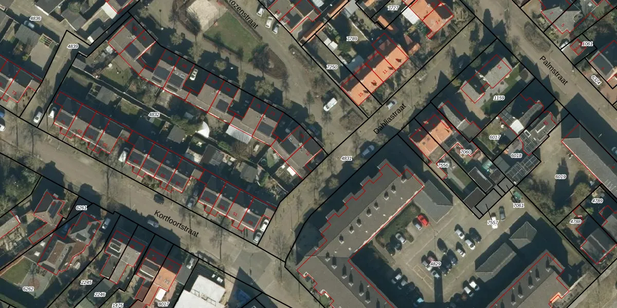 Het perceel waarop Dahliastraat 17 staat heeft een oppervlakte van 3427 m². Dit is een zeer groot perceel. De perceeloppervlakte wordt geregistreerd door het Kadaster. Gedetailleerde informatie over de maten van dit perceel kunt u vinden in het rapport Kadastrale kaart met maatvoering van Dahliastraat 17.