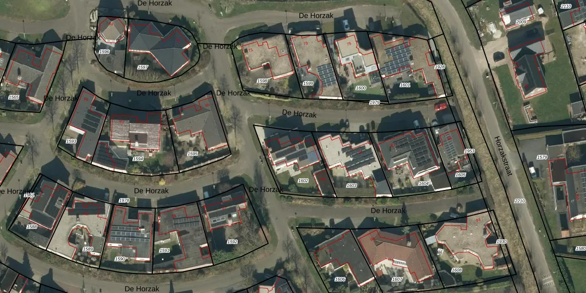 Het perceel waarop De Horzak 79 staat heeft een oppervlakte van 434 m². Dit is een groot perceel. De perceeloppervlakte wordt geregistreerd door het Kadaster. Gedetailleerde informatie over de maten van dit perceel kunt u vinden in het rapport Kadastrale kaart met maatvoering van De Horzak 79.