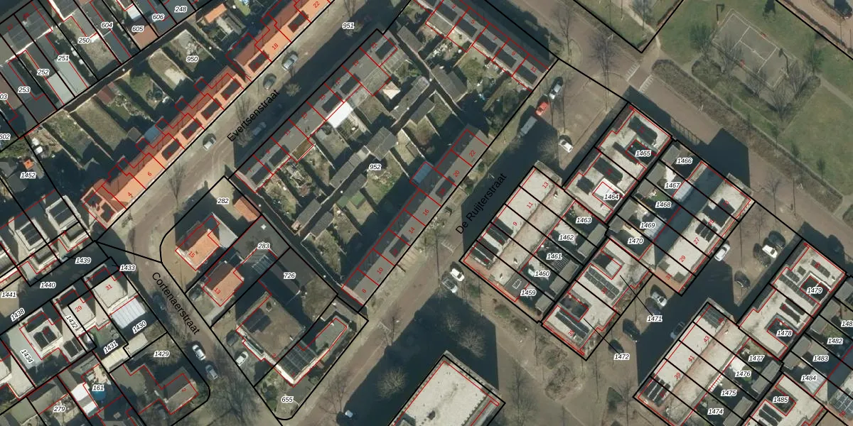 Het perceel waarop De Ruijterstraat 16 staat heeft een oppervlakte van 2872 m². Dit is een zeer groot perceel. De perceeloppervlakte wordt geregistreerd door het Kadaster. Gedetailleerde informatie over de maten van dit perceel kunt u vinden in het rapport Kadastrale kaart met maatvoering van De Ruijterstraat 16.