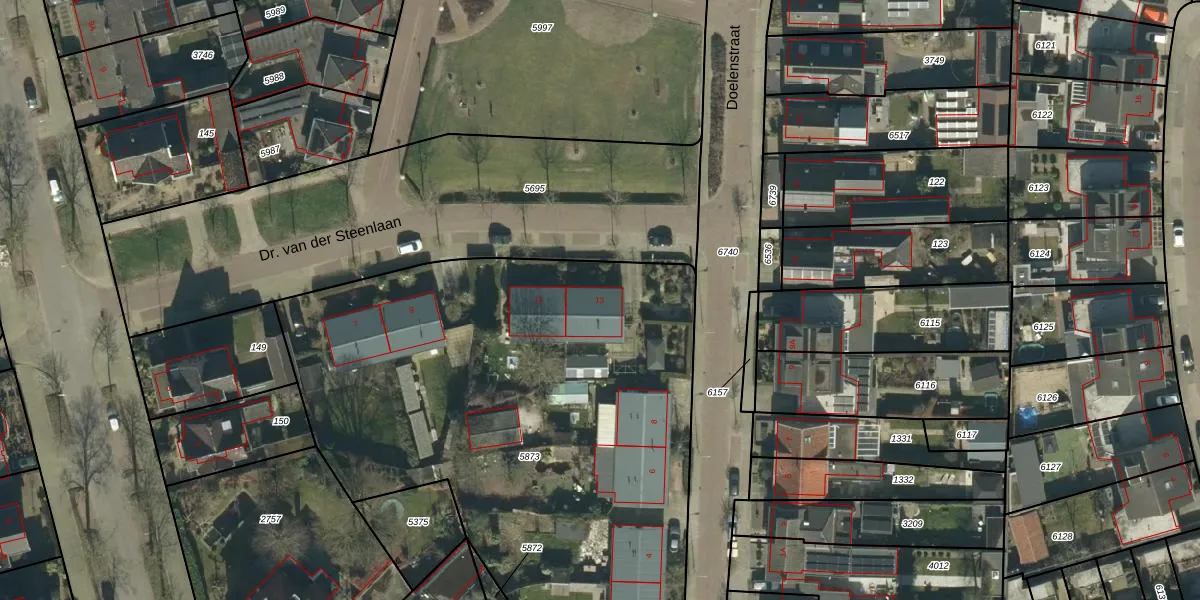 Het perceel waarop Dr. van der Steenlaan 13 staat heeft een oppervlakte van 4072 m². Dit is een zeer groot perceel. De perceeloppervlakte wordt geregistreerd door het Kadaster. Gedetailleerde informatie over de maten van dit perceel kunt u vinden in het rapport Kadastrale kaart met maatvoering van Dr. van der Steenlaan 13.
