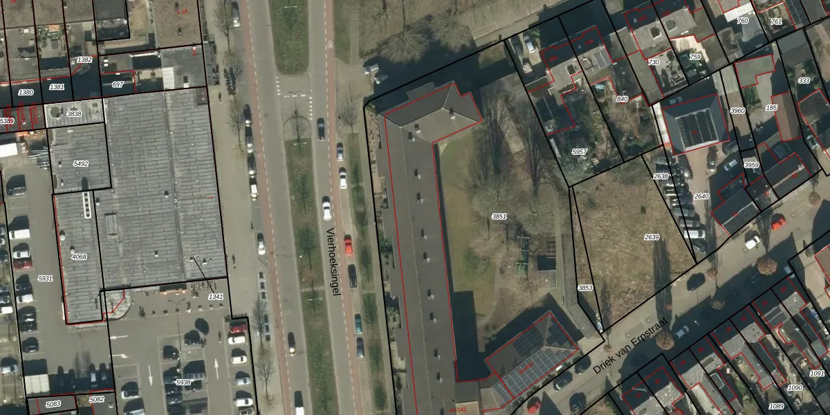 Het perceel waarop Driek van Erpstraat 107 staat heeft een oppervlakte van 3833 m². Dit is een zeer groot perceel. De perceeloppervlakte wordt geregistreerd door het Kadaster. Gedetailleerde informatie over de maten van dit perceel kunt u vinden in het rapport Kadastrale kaart met maatvoering van Driek van Erpstraat 107.