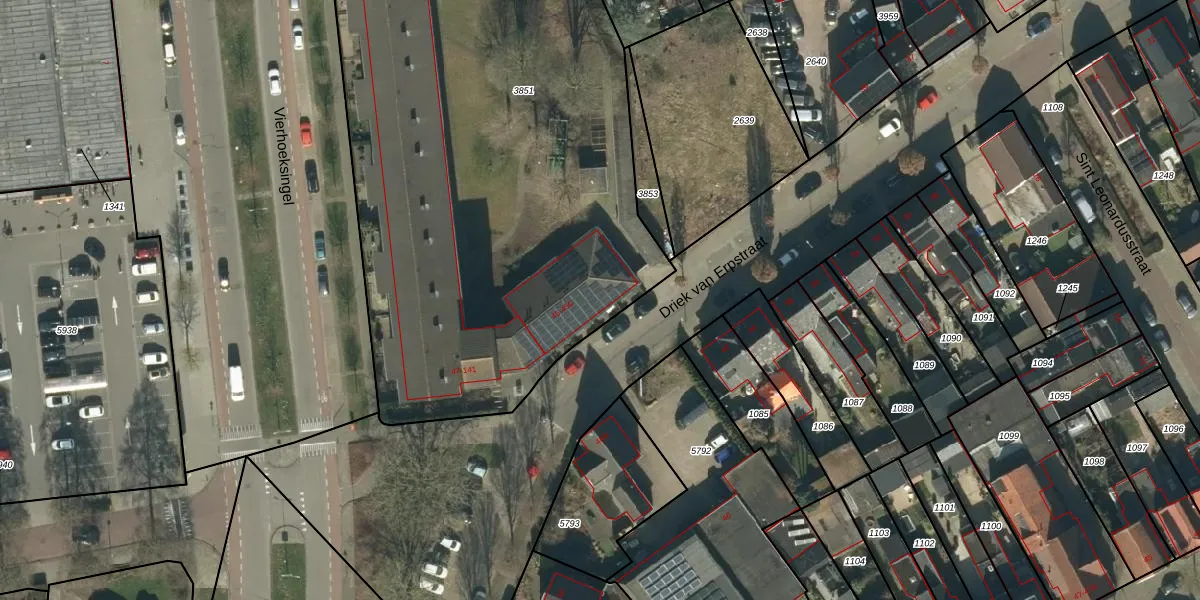 Het perceel waarop Driek van Erpstraat 45-B staat heeft een oppervlakte van 3833 m². Dit is een zeer groot perceel. De perceeloppervlakte wordt geregistreerd door het Kadaster. Gedetailleerde informatie over de maten van dit perceel kunt u vinden in het rapport Kadastrale kaart met maatvoering van Driek van Erpstraat 45-B.