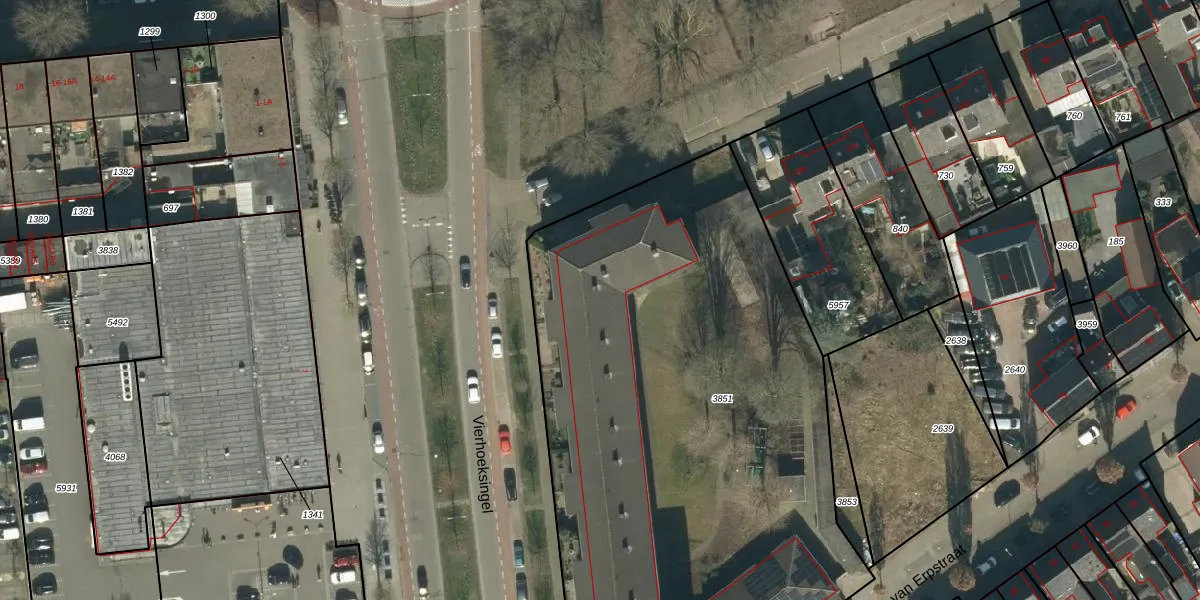 Het perceel waarop Driek van Erpstraat 89 staat heeft een oppervlakte van 3833 m². Dit is een zeer groot perceel. De perceeloppervlakte wordt geregistreerd door het Kadaster. Gedetailleerde informatie over de maten van dit perceel kunt u vinden in het rapport Kadastrale kaart met maatvoering van Driek van Erpstraat 89.