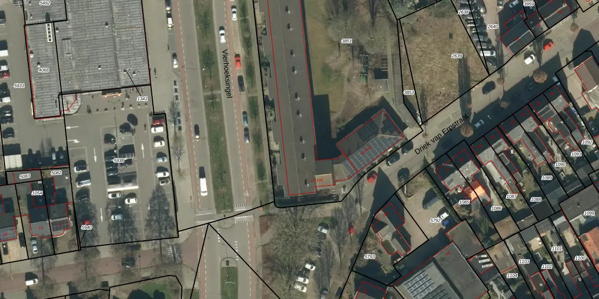 Het perceel waarop Driek van Erpstraat 95 staat heeft een oppervlakte van 3833 m². Dit is een zeer groot perceel. De perceeloppervlakte wordt geregistreerd door het Kadaster. Gedetailleerde informatie over de maten van dit perceel kunt u vinden in het rapport Kadastrale kaart met maatvoering van Driek van Erpstraat 95.