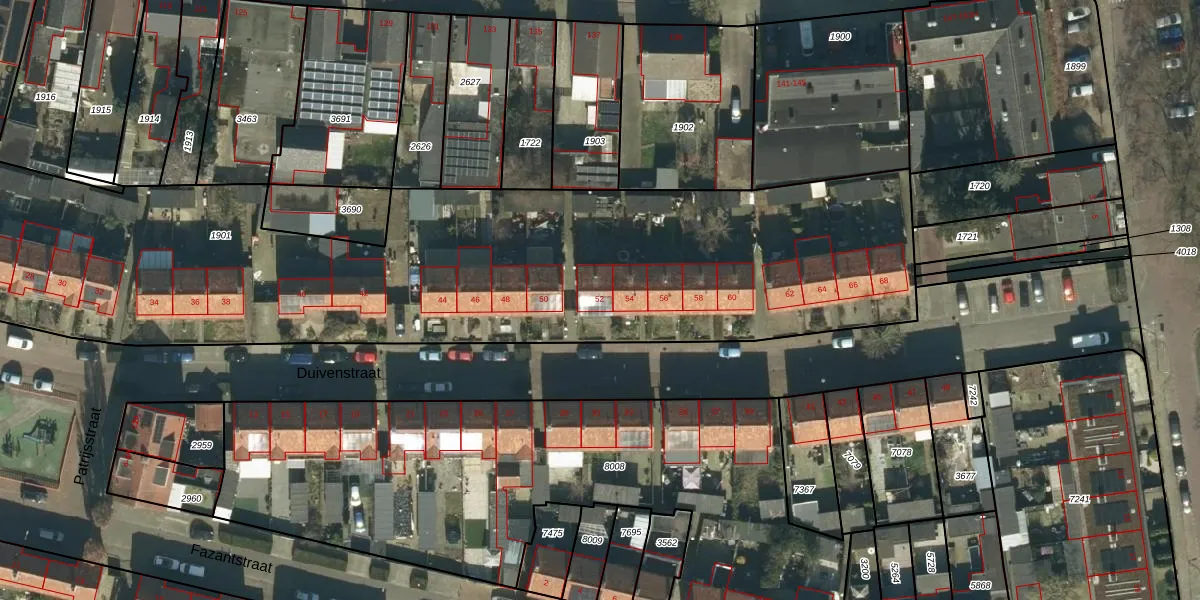 Het perceel waarop Duivenstraat 52 staat heeft een oppervlakte van 6510 m². Dit is een zeer groot perceel. De perceeloppervlakte wordt geregistreerd door het Kadaster. Gedetailleerde informatie over de maten van dit perceel kunt u vinden in het rapport Kadastrale kaart met maatvoering van Duivenstraat 52.