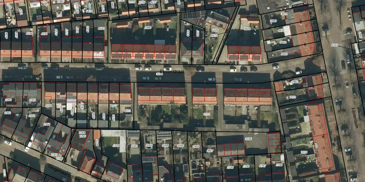 Het perceel waarop Eksterstraat 37 staat heeft een oppervlakte van 2086 m². Dit is een zeer groot perceel. De perceeloppervlakte wordt geregistreerd door het Kadaster. Gedetailleerde informatie over de maten van dit perceel kunt u vinden in het rapport Kadastrale kaart met maatvoering van Eksterstraat 37.