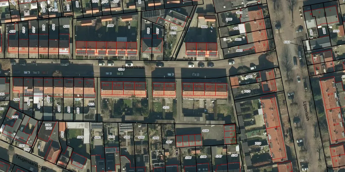 Het perceel waarop Eksterstraat 45 staat heeft een oppervlakte van 2086 m². Dit is een zeer groot perceel. De perceeloppervlakte wordt geregistreerd door het Kadaster. Gedetailleerde informatie over de maten van dit perceel kunt u vinden in het rapport Kadastrale kaart met maatvoering van Eksterstraat 45.