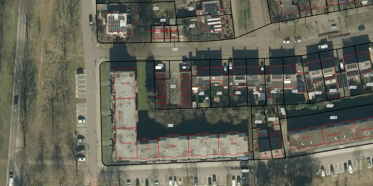 Het perceel waarop Emmalaan 11 staat heeft een oppervlakte van 440 m². Dit is een groot perceel. De perceeloppervlakte wordt geregistreerd door het Kadaster. Gedetailleerde informatie over de maten van dit perceel kunt u vinden in het rapport Kadastrale kaart met maatvoering van Emmalaan 11.