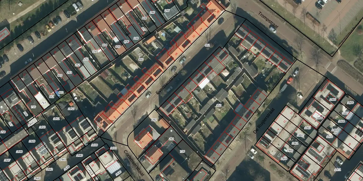 Het perceel waarop Evertsenstraat 11 staat heeft een oppervlakte van 2872 m². Dit is een zeer groot perceel. De perceeloppervlakte wordt geregistreerd door het Kadaster. Gedetailleerde informatie over de maten van dit perceel kunt u vinden in het rapport Kadastrale kaart met maatvoering van Evertsenstraat 11.