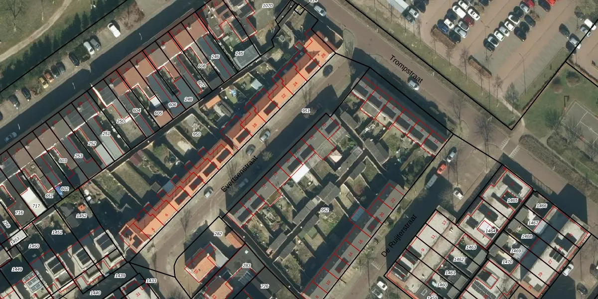 Het perceel waarop Evertsenstraat 17 staat heeft een oppervlakte van 2872 m². Dit is een zeer groot perceel. De perceeloppervlakte wordt geregistreerd door het Kadaster. Gedetailleerde informatie over de maten van dit perceel kunt u vinden in het rapport Kadastrale kaart met maatvoering van Evertsenstraat 17.