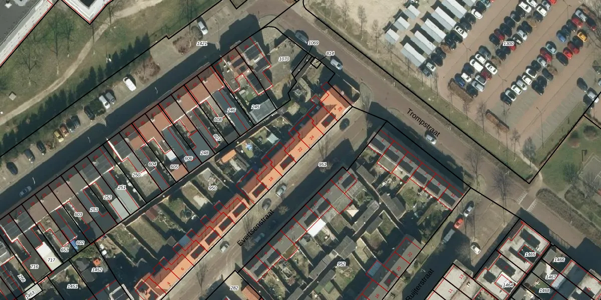 Het perceel waarop Evertsenstraat 22 staat heeft een oppervlakte van 2167 m². Dit is een zeer groot perceel. De perceeloppervlakte wordt geregistreerd door het Kadaster. Gedetailleerde informatie over de maten van dit perceel kunt u vinden in het rapport Kadastrale kaart met maatvoering van Evertsenstraat 22.