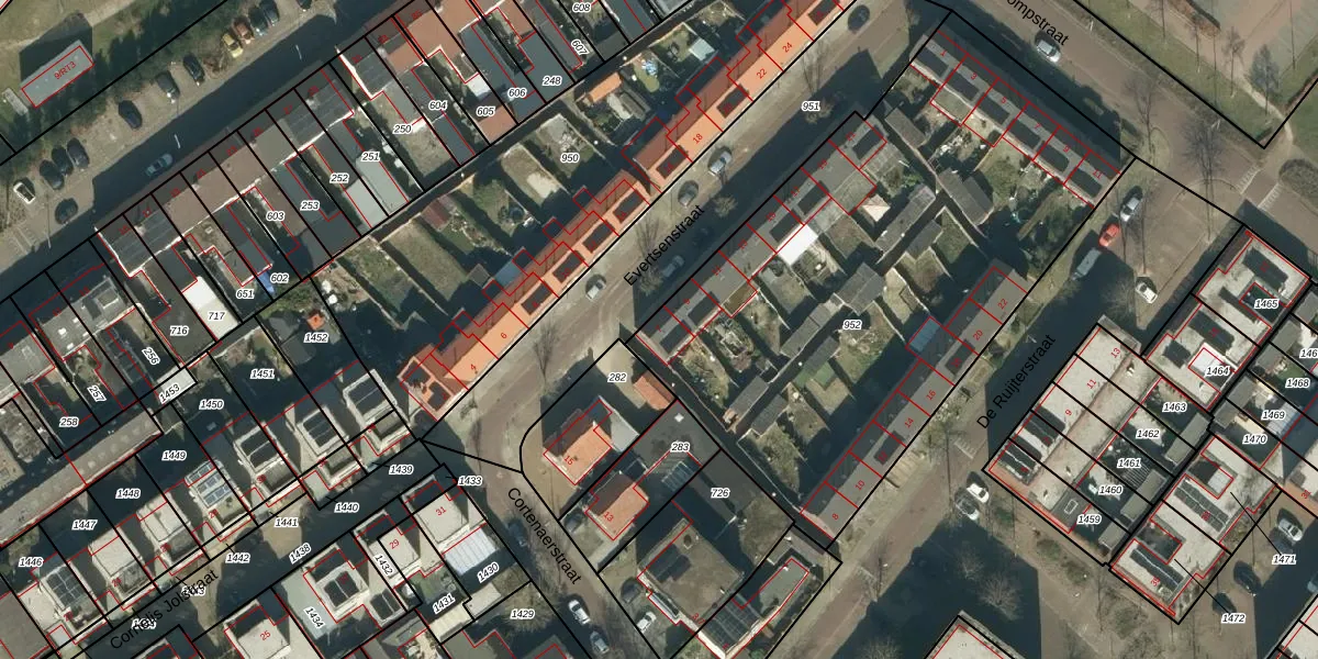Het perceel waarop Evertsenstraat 7 staat heeft een oppervlakte van 2872 m². Dit is een zeer groot perceel. De perceeloppervlakte wordt geregistreerd door het Kadaster. Gedetailleerde informatie over de maten van dit perceel kunt u vinden in het rapport Kadastrale kaart met maatvoering van Evertsenstraat 7.