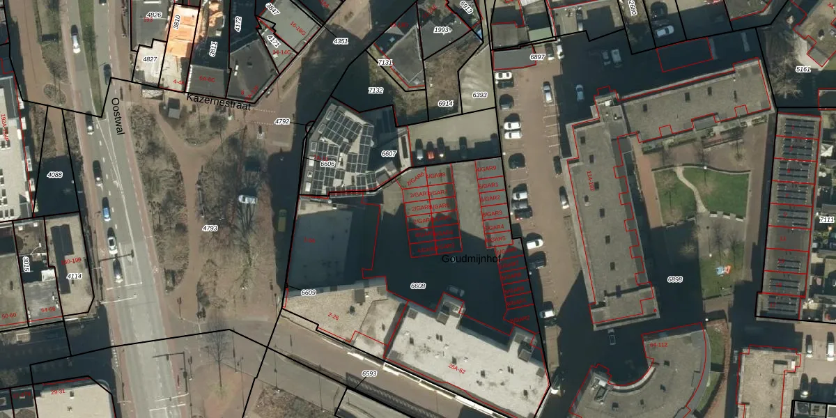 Goudmijnhof 2-GAR8 is gelegen op kadastraal perceel OSS00E6608. Deze kadastrale aanduiding is uniek en wordt gebruikt door het Kadaster om eigendomsrechten en andere zakelijke rechten vast te leggen. Het perceel maakt onderdeel uit van de kadastrale gemeente Oss.