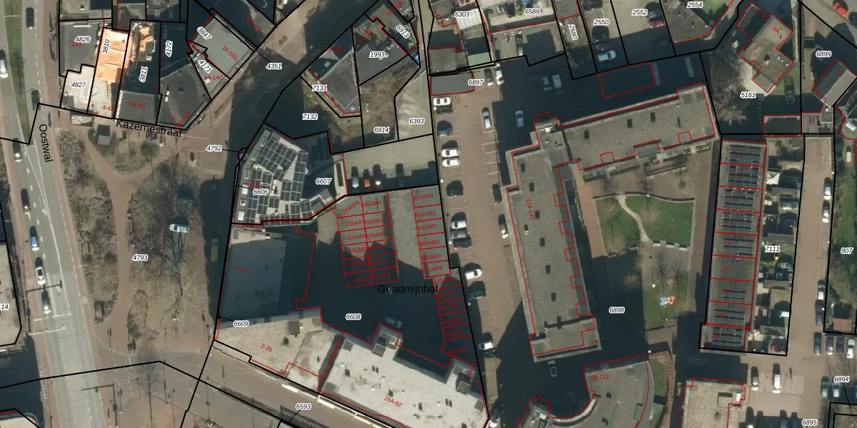 Goudmijnhof 6-GAR1 is gelegen op kadastraal perceel OSS00E6608. Deze kadastrale aanduiding is uniek en wordt gebruikt door het Kadaster om eigendomsrechten en andere zakelijke rechten vast te leggen. Het perceel maakt onderdeel uit van de kadastrale gemeente Oss.