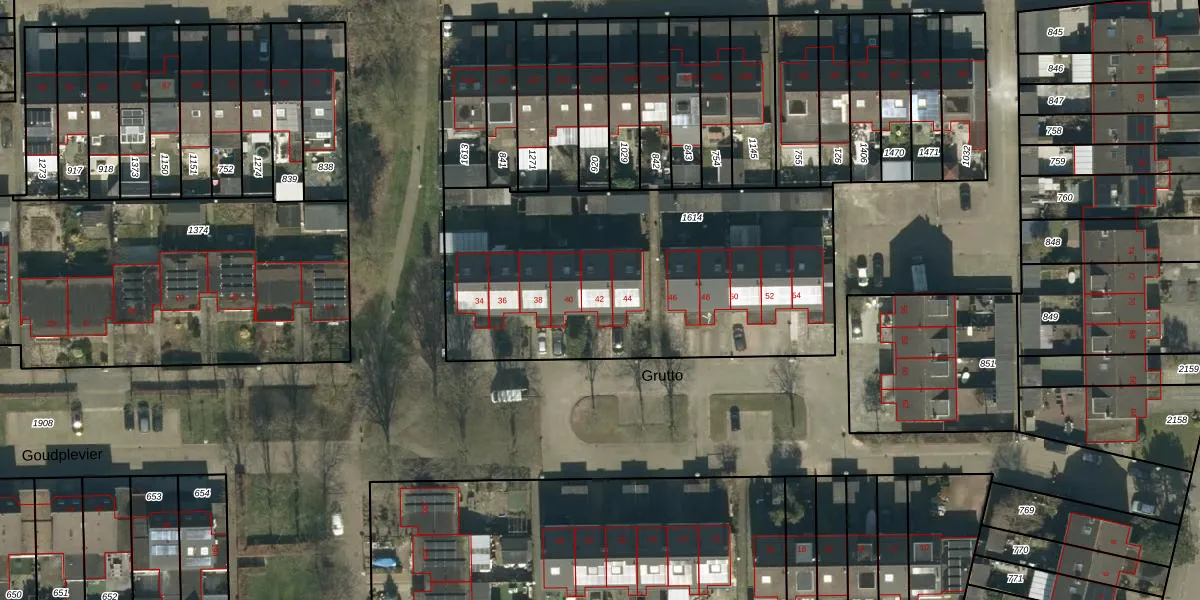Het perceel waarop Grutto 42 staat heeft een oppervlakte van 1972 m². Dit is een zeer groot perceel. De perceeloppervlakte wordt geregistreerd door het Kadaster. Gedetailleerde informatie over de maten van dit perceel kunt u vinden in het rapport Kadastrale kaart met maatvoering van Grutto 42.