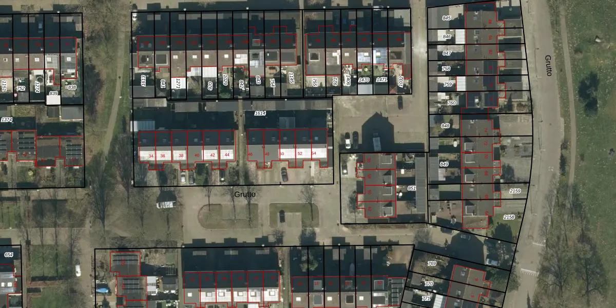 Het perceel waarop Grutto 52 staat heeft een oppervlakte van 1972 m². Dit is een zeer groot perceel. De perceeloppervlakte wordt geregistreerd door het Kadaster. Gedetailleerde informatie over de maten van dit perceel kunt u vinden in het rapport Kadastrale kaart met maatvoering van Grutto 52.