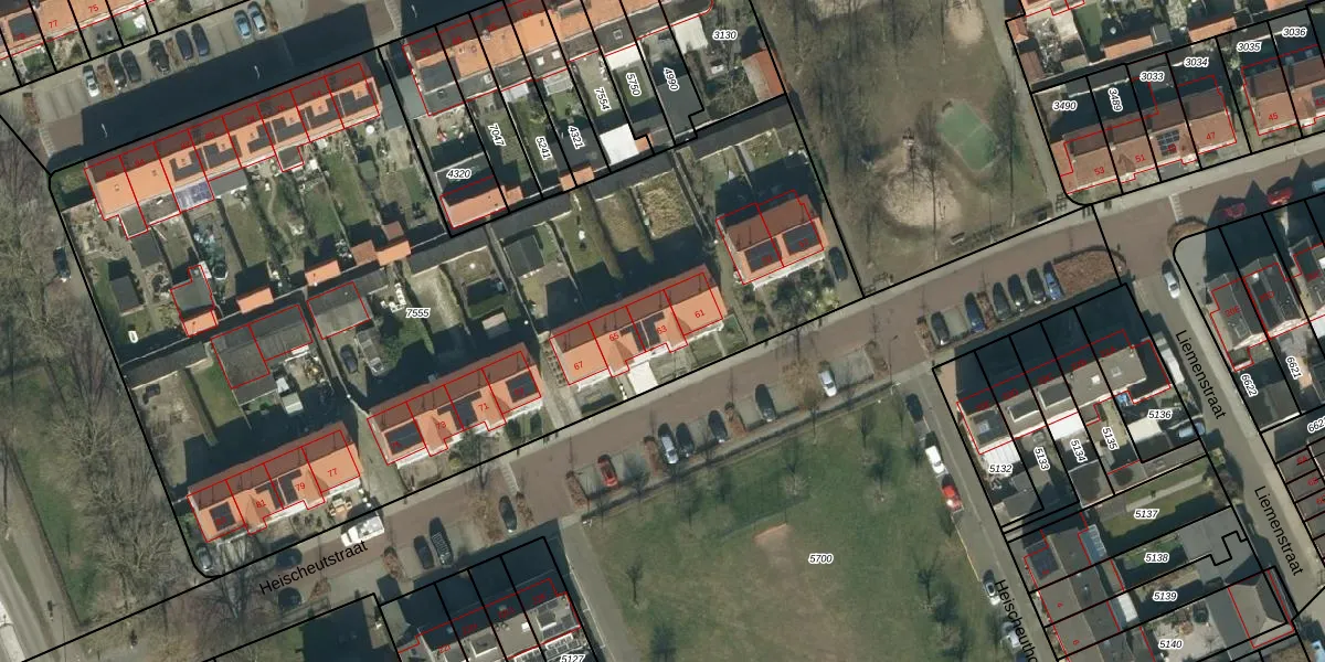 Het perceel waarop Heischeutstraat 63 staat heeft een oppervlakte van 5326 m². Dit is een zeer groot perceel. De perceeloppervlakte wordt geregistreerd door het Kadaster. Gedetailleerde informatie over de maten van dit perceel kunt u vinden in het rapport Kadastrale kaart met maatvoering van Heischeutstraat 63.