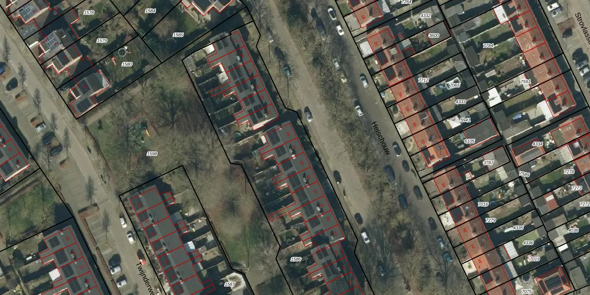 Het perceel waarop Heischouw 41 staat heeft een oppervlakte van 2580 m². Dit is een zeer groot perceel. De perceeloppervlakte wordt geregistreerd door het Kadaster. Gedetailleerde informatie over de maten van dit perceel kunt u vinden in het rapport Kadastrale kaart met maatvoering van Heischouw 41.