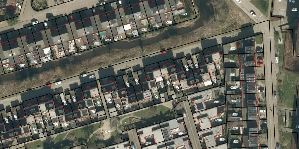 Het perceel waarop Heraut 14 staat heeft een oppervlakte van 180 m². Dit is een middelgroot perceel. De perceeloppervlakte wordt geregistreerd door het Kadaster. Gedetailleerde informatie over de maten van dit perceel kunt u vinden in het rapport Kadastrale kaart met maatvoering van Heraut 14.