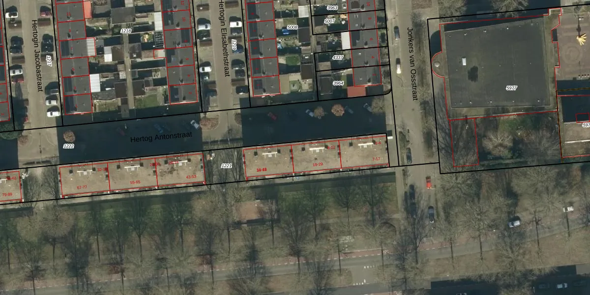 Het perceel waarop Hertog Antonstraat 12 staat heeft een oppervlakte van 2011 m². Dit is een zeer groot perceel. De perceeloppervlakte wordt geregistreerd door het Kadaster. Gedetailleerde informatie over de maten van dit perceel kunt u vinden in het rapport Kadastrale kaart met maatvoering van Hertog Antonstraat 12.