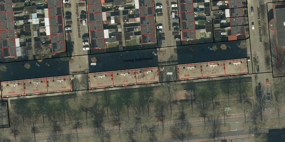 Het perceel waarop Hertog Antonstraat 22 staat heeft een oppervlakte van 2011 m². Dit is een zeer groot perceel. De perceeloppervlakte wordt geregistreerd door het Kadaster. Gedetailleerde informatie over de maten van dit perceel kunt u vinden in het rapport Kadastrale kaart met maatvoering van Hertog Antonstraat 22.