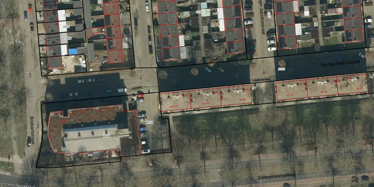 Het perceel waarop Hertog Antonstraat 50 staat heeft een oppervlakte van 2011 m². Dit is een zeer groot perceel. De perceeloppervlakte wordt geregistreerd door het Kadaster. Gedetailleerde informatie over de maten van dit perceel kunt u vinden in het rapport Kadastrale kaart met maatvoering van Hertog Antonstraat 50.