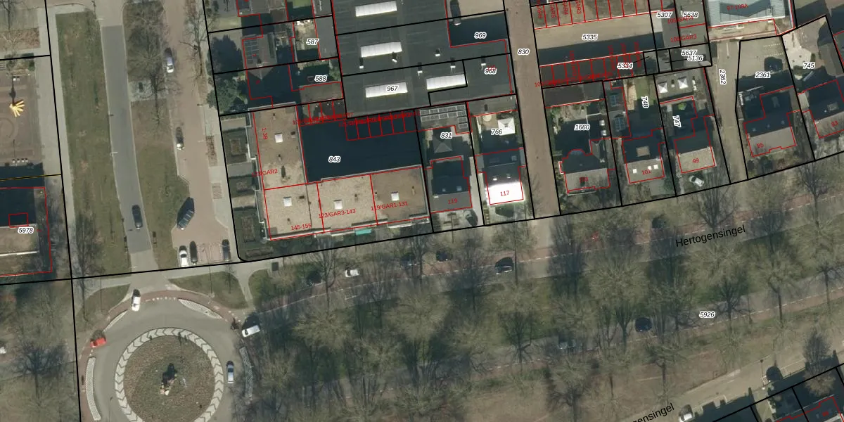 Hertogensingel 119-GAR1 is gelegen op kadastraal perceel OSS00K843. Deze kadastrale aanduiding is uniek en wordt gebruikt door het Kadaster om eigendomsrechten en andere zakelijke rechten vast te leggen. Het perceel maakt onderdeel uit van de kadastrale gemeente Oss.