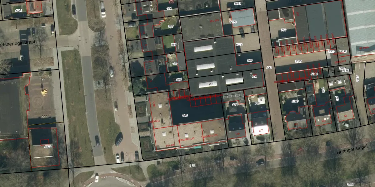 Hertogensingel 121-GAR7 is gelegen op kadastraal perceel OSS00K843. Deze kadastrale aanduiding is uniek en wordt gebruikt door het Kadaster om eigendomsrechten en andere zakelijke rechten vast te leggen. Het perceel maakt onderdeel uit van de kadastrale gemeente Oss.