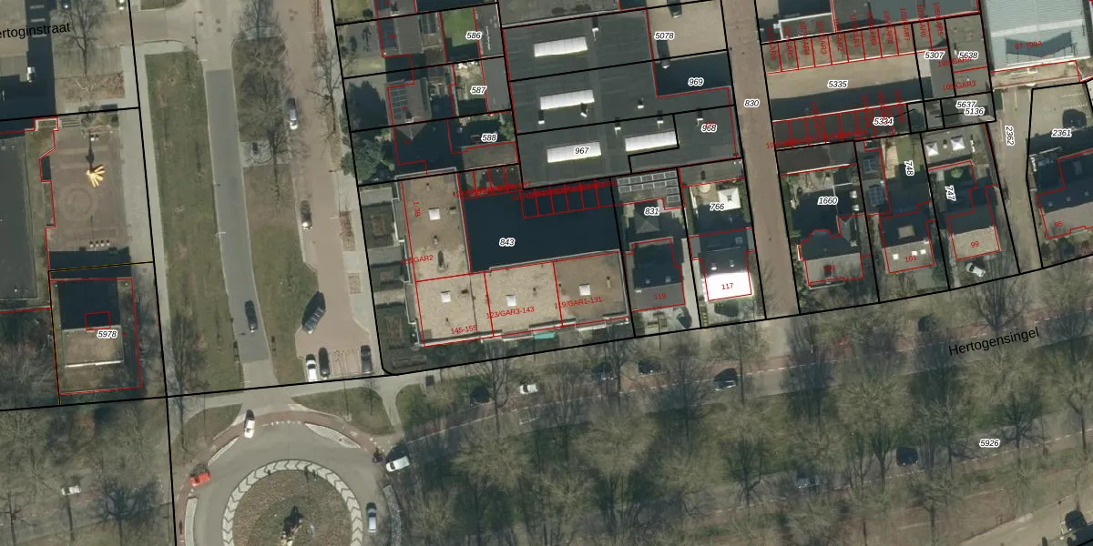 Hertogensingel 123-GAR5 is gelegen op kadastraal perceel OSS00K843. Deze kadastrale aanduiding is uniek en wordt gebruikt door het Kadaster om eigendomsrechten en andere zakelijke rechten vast te leggen. Het perceel maakt onderdeel uit van de kadastrale gemeente Oss.