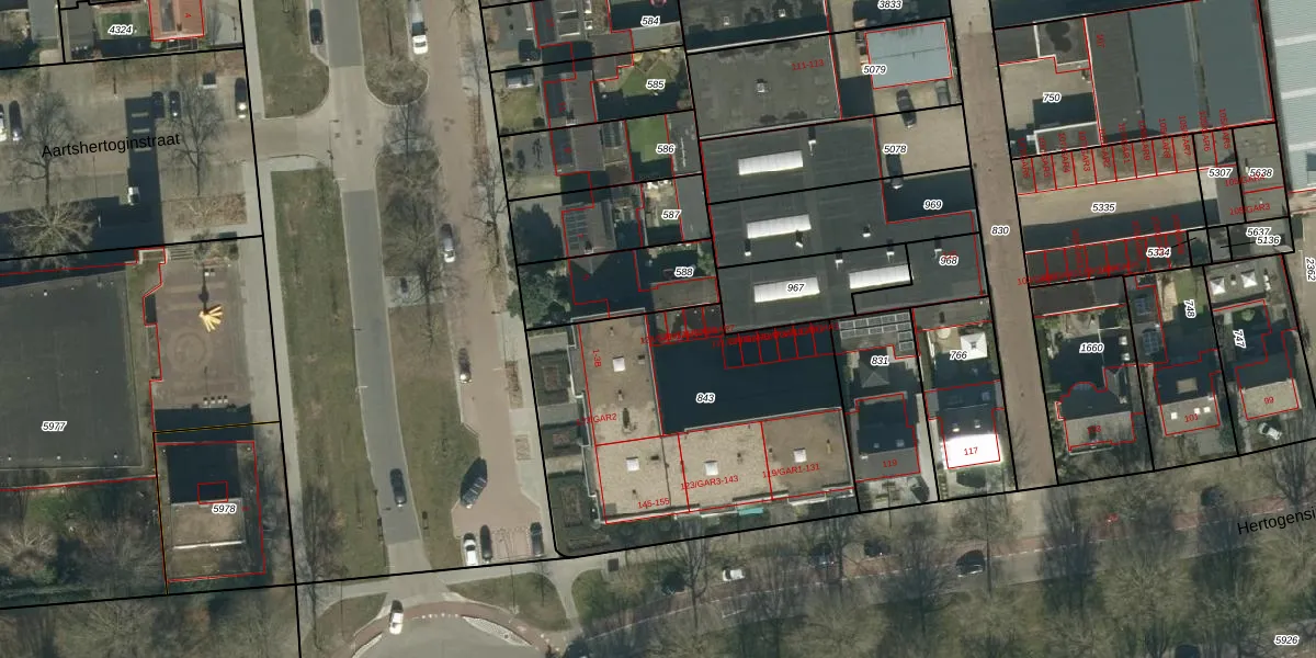 Hertogensingel 123-GAR1 is gelegen op kadastraal perceel OSS00K843. Deze kadastrale aanduiding is uniek en wordt gebruikt door het Kadaster om eigendomsrechten en andere zakelijke rechten vast te leggen. Het perceel maakt onderdeel uit van de kadastrale gemeente Oss.