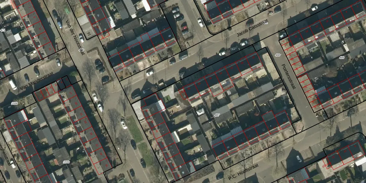 Het perceel waarop Jacob Catsstraat 30-A staat heeft een oppervlakte van 4114 m². Dit is een zeer groot perceel. De perceeloppervlakte wordt geregistreerd door het Kadaster. Gedetailleerde informatie over de maten van dit perceel kunt u vinden in het rapport Kadastrale kaart met maatvoering van Jacob Catsstraat 30-A.
