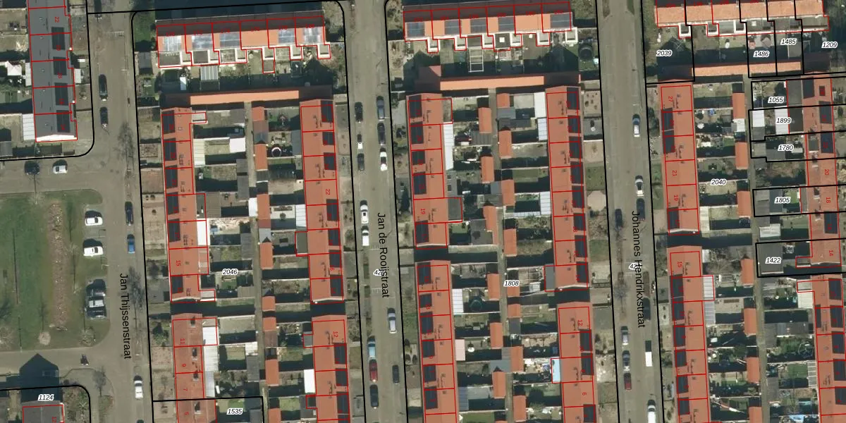 Het perceel waarop Jan de Rooijstraat 19 staat heeft een oppervlakte van 5743 m². Dit is een zeer groot perceel. De perceeloppervlakte wordt geregistreerd door het Kadaster. Gedetailleerde informatie over de maten van dit perceel kunt u vinden in het rapport Kadastrale kaart met maatvoering van Jan de Rooijstraat 19.