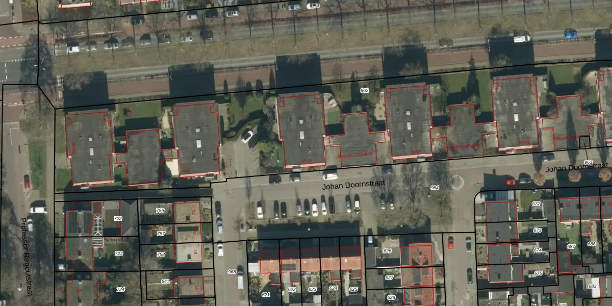 Het perceel waarop Johan Doornstraat 20 staat heeft een oppervlakte van 5645 m². Dit is een zeer groot perceel. De perceeloppervlakte wordt geregistreerd door het Kadaster. Gedetailleerde informatie over de maten van dit perceel kunt u vinden in het rapport Kadastrale kaart met maatvoering van Johan Doornstraat 20.