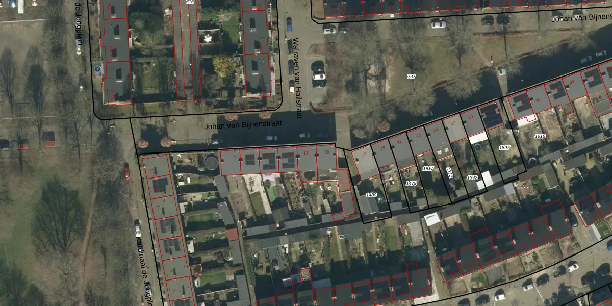 Het perceel waarop Johan van Bijnenstraat 13 staat heeft een oppervlakte van 1,4 ha. Dit is een zeer groot perceel. De perceeloppervlakte wordt geregistreerd door het Kadaster. Gedetailleerde informatie over de maten van dit perceel kunt u vinden in het rapport Kadastrale kaart met maatvoering van Johan van Bijnenstraat 13.