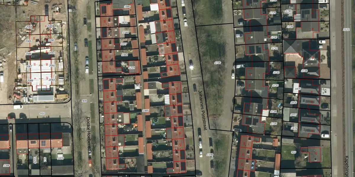 Het perceel waarop Johannes Poststraat 24 staat heeft een oppervlakte van 4216 m². Dit is een zeer groot perceel. De perceeloppervlakte wordt geregistreerd door het Kadaster. Gedetailleerde informatie over de maten van dit perceel kunt u vinden in het rapport Kadastrale kaart met maatvoering van Johannes Poststraat 24.