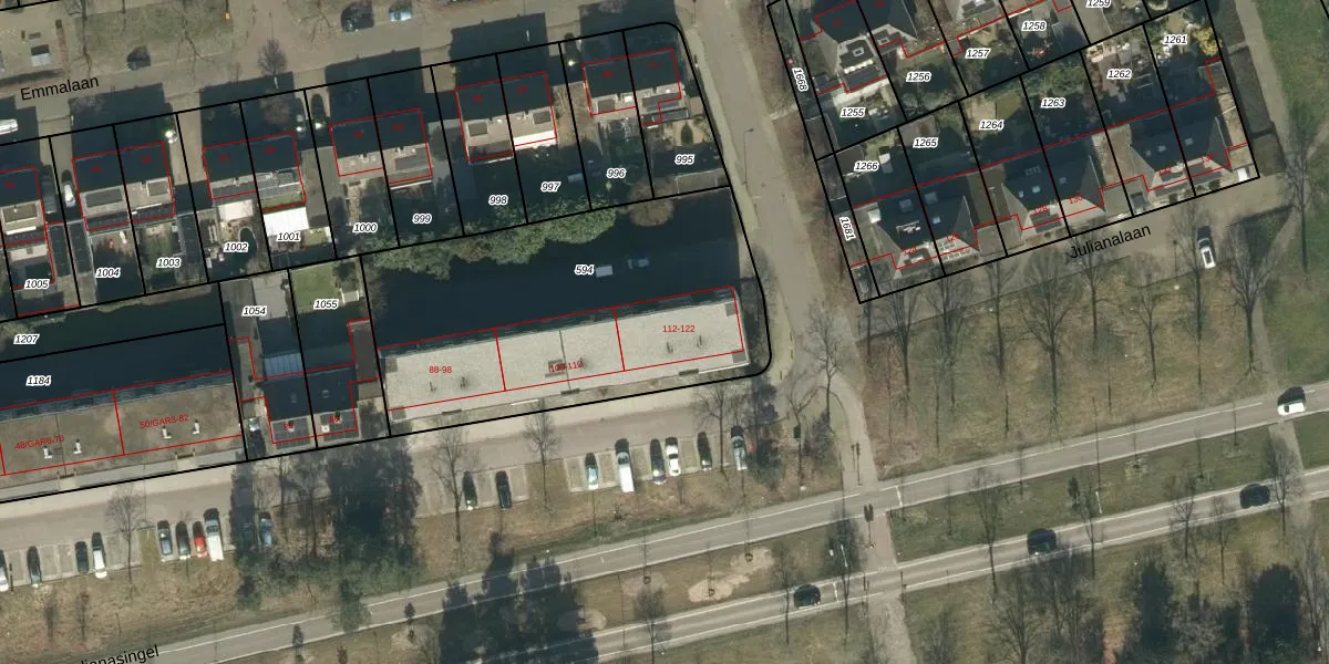 Julianalaan 112 is gelegen op kadastraal perceel OSS00F594. Deze kadastrale aanduiding is uniek en wordt gebruikt door het Kadaster om eigendomsrechten en andere zakelijke rechten vast te leggen. Het perceel maakt onderdeel uit van de kadastrale gemeente Oss.