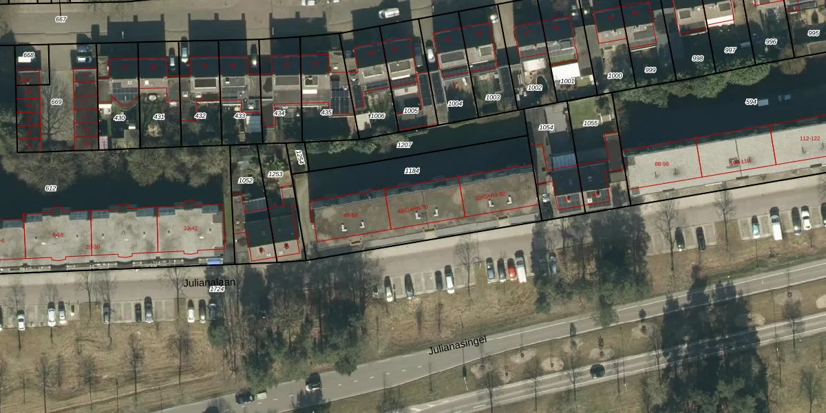 Het perceel waarop Julianalaan 60 staat heeft een oppervlakte van 1230 m². Dit is een zeer groot perceel. De perceeloppervlakte wordt geregistreerd door het Kadaster. Gedetailleerde informatie over de maten van dit perceel kunt u vinden in het rapport Kadastrale kaart met maatvoering van Julianalaan 60.