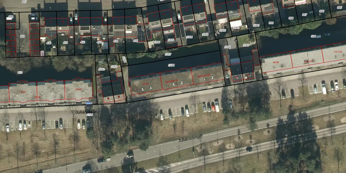 Het perceel waarop Julianalaan 64 staat heeft een oppervlakte van 1230 m². Dit is een zeer groot perceel. De perceeloppervlakte wordt geregistreerd door het Kadaster. Gedetailleerde informatie over de maten van dit perceel kunt u vinden in het rapport Kadastrale kaart met maatvoering van Julianalaan 64.