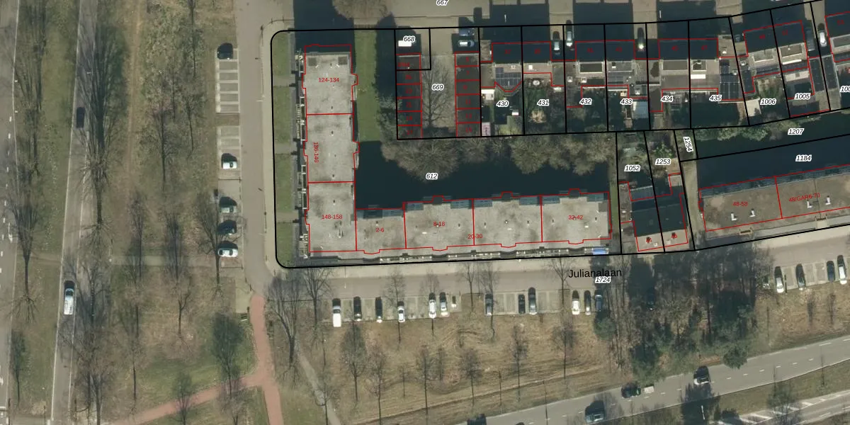Het perceel waarop Julianalaan 8 staat heeft een oppervlakte van 3135 m². Dit is een zeer groot perceel. De perceeloppervlakte wordt geregistreerd door het Kadaster. Gedetailleerde informatie over de maten van dit perceel kunt u vinden in het rapport Kadastrale kaart met maatvoering van Julianalaan 8.
