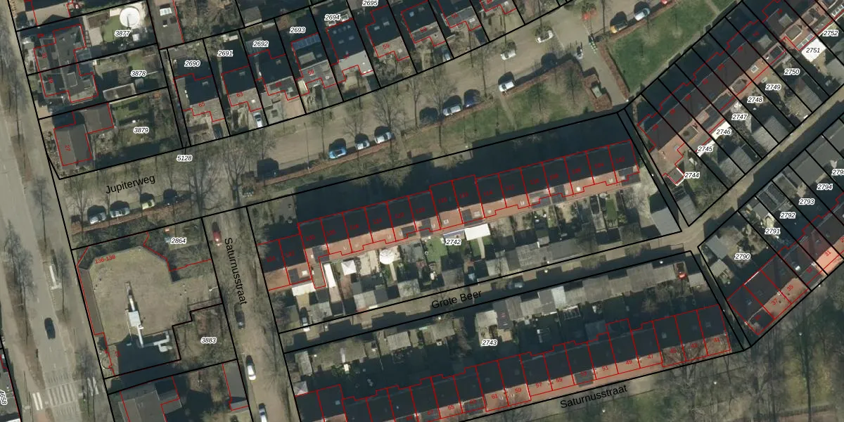 Het perceel waarop Jupiterweg 120 staat heeft een oppervlakte van 2941 m². Dit is een zeer groot perceel. De perceeloppervlakte wordt geregistreerd door het Kadaster. Gedetailleerde informatie over de maten van dit perceel kunt u vinden in het rapport Kadastrale kaart met maatvoering van Jupiterweg 120.