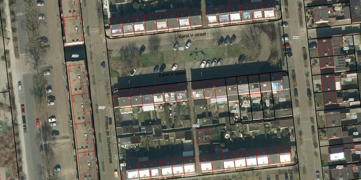 Het perceel waarop Karel V-straat 18 staat heeft een oppervlakte van 4272 m². Dit is een zeer groot perceel. De perceeloppervlakte wordt geregistreerd door het Kadaster. Gedetailleerde informatie over de maten van dit perceel kunt u vinden in het rapport Kadastrale kaart met maatvoering van Karel V-straat 18.
