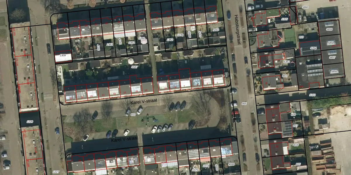 Het perceel waarop Karel V-straat 9 staat heeft een oppervlakte van 2978 m². Dit is een zeer groot perceel. De perceeloppervlakte wordt geregistreerd door het Kadaster. Gedetailleerde informatie over de maten van dit perceel kunt u vinden in het rapport Kadastrale kaart met maatvoering van Karel V-straat 9.