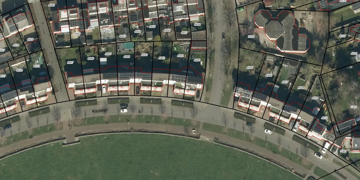 Het perceel waarop Kasteel 17 staat heeft een oppervlakte van 310 m². Dit is een groot perceel. De perceeloppervlakte wordt geregistreerd door het Kadaster. Gedetailleerde informatie over de maten van dit perceel kunt u vinden in het rapport Kadastrale kaart met maatvoering van Kasteel 17.