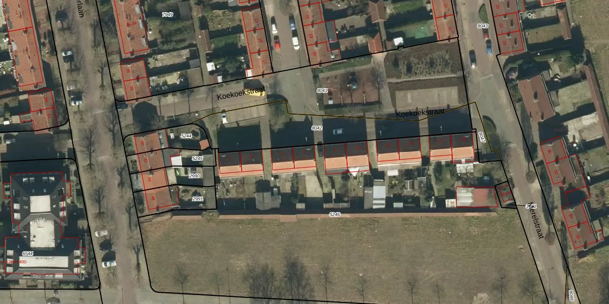 Het perceel waarop Koekoekstraat 7 staat heeft een oppervlakte van 5895 m². Dit is een zeer groot perceel. De perceeloppervlakte wordt geregistreerd door het Kadaster. Gedetailleerde informatie over de maten van dit perceel kunt u vinden in het rapport Kadastrale kaart met maatvoering van Koekoekstraat 7.